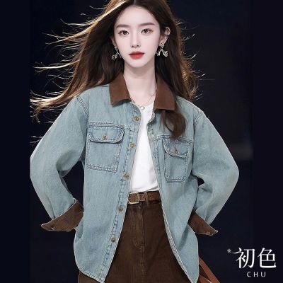 初色 撞色翻領長袖單排扣牛仔外套女外套-藍色-38360(M-2XL可選)