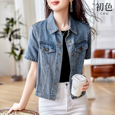 初色 氣質翻領薄款單排扣休閒牛仔短袖襯衫外套-牛仔藍-68566(M-XL可選)$399