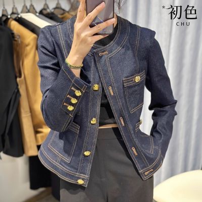 初色 小香風撞色明線金釦修身圓領長袖牛仔短外套女外套-深藍色-38028(M-XL可選)