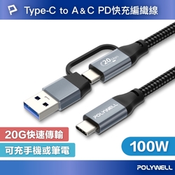 POLYWELL 二合一PD編織快充線 USB-C Lightning 1M$16483折