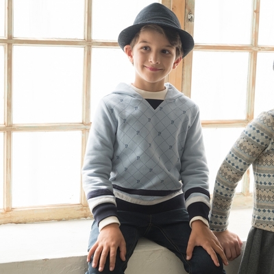 PIPPY斜格印花內刷毛棉質連帽上衣-水色 下折扣
