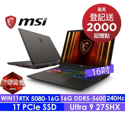 MSI微星 Vector 16 HX AI A2XWIG-014TW 240Hz 16吋電競筆電(Ultra 9 275HX/16G/1T SSD/RTX5080-16G/Win11)$74,999